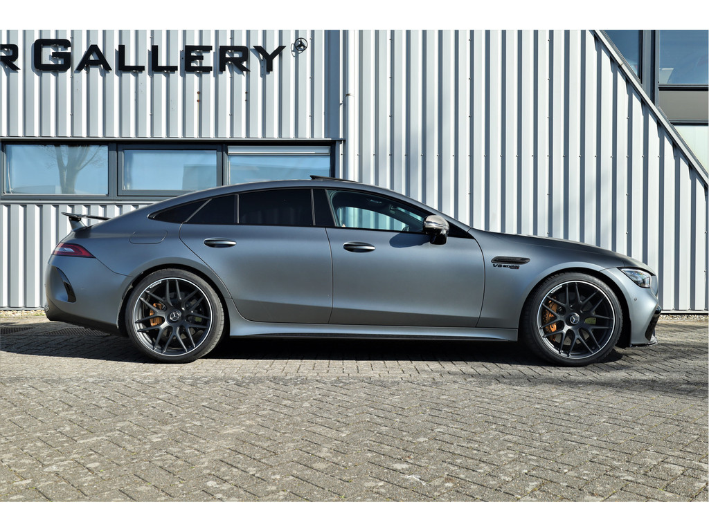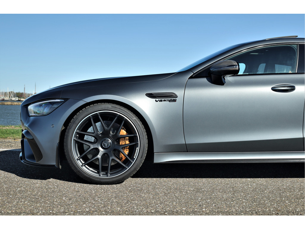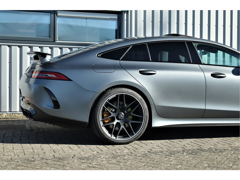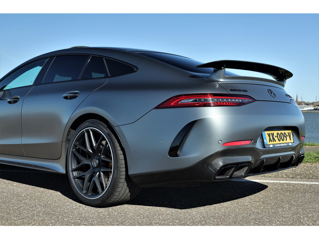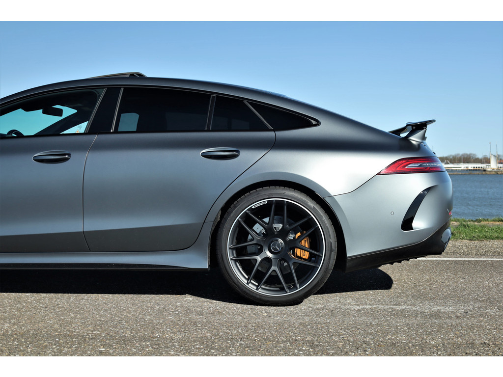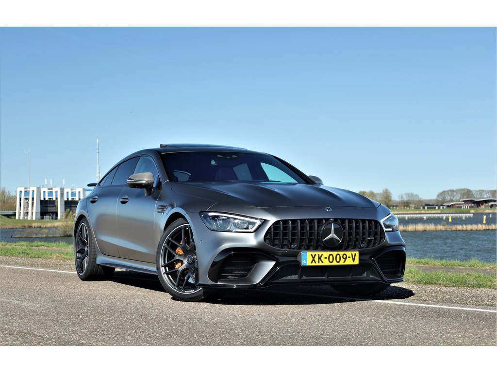 Retesnelle en bomvolle Mercedes AMG GT 63 S 4MATIC+ Premium Plus, uitgevoerd in seleniet grijs magno met een zwart leder exclusief interieur; een schitterende combinatie.