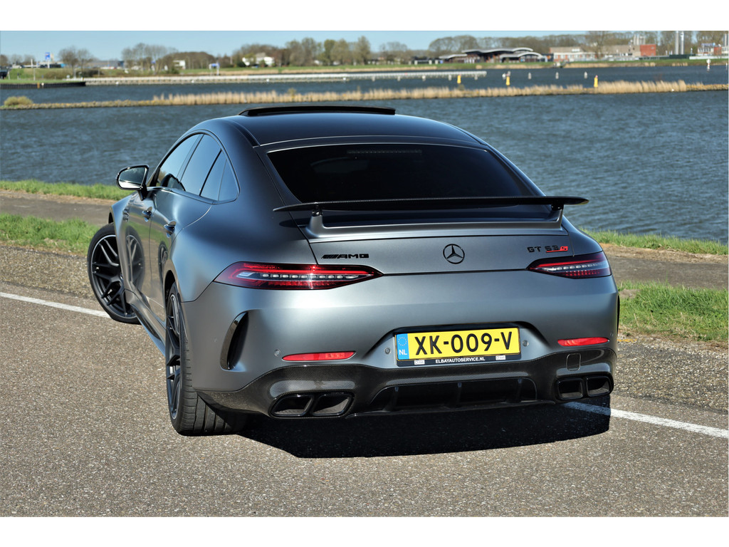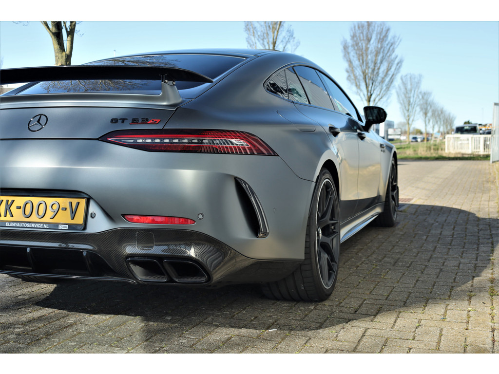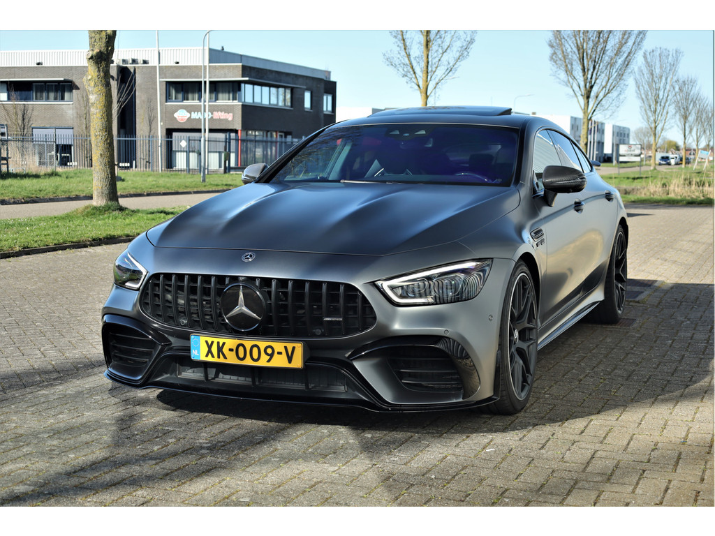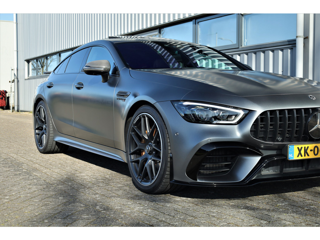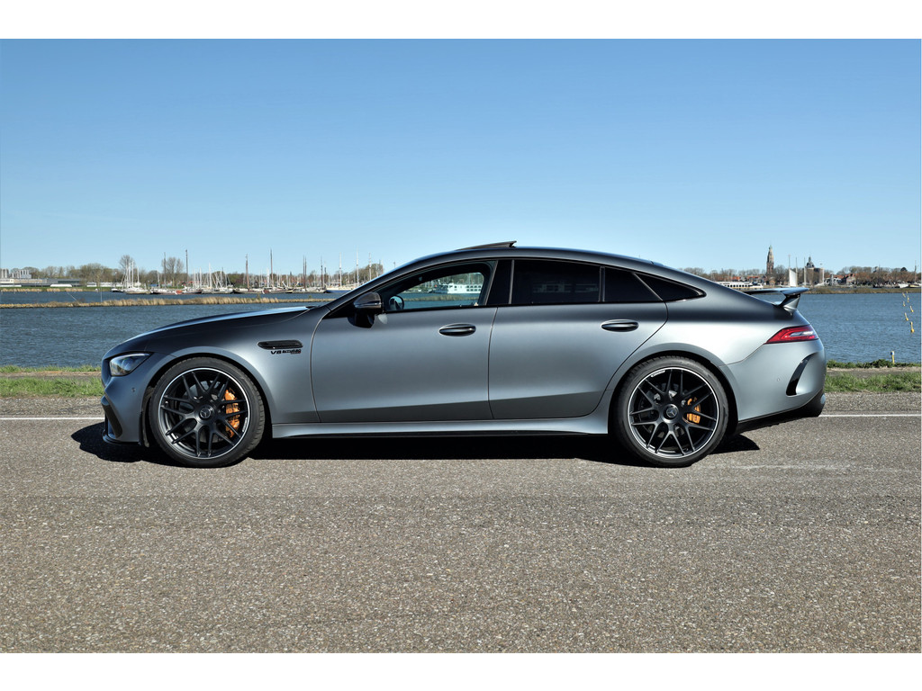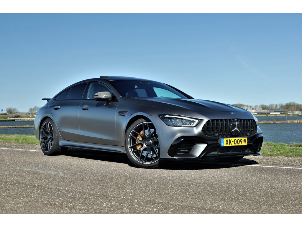 Retesnelle en bomvolle Mercedes AMG GT 63 S 4MATIC+ Premium Plus, uitgevoerd in seleniet grijs magno met een zwart leder exclusief interieur; een schitterende combinatie.
