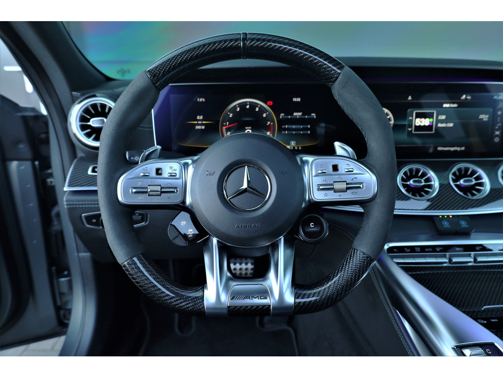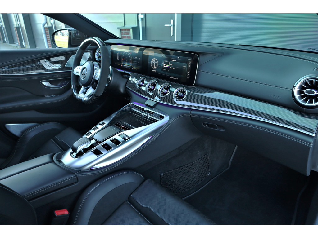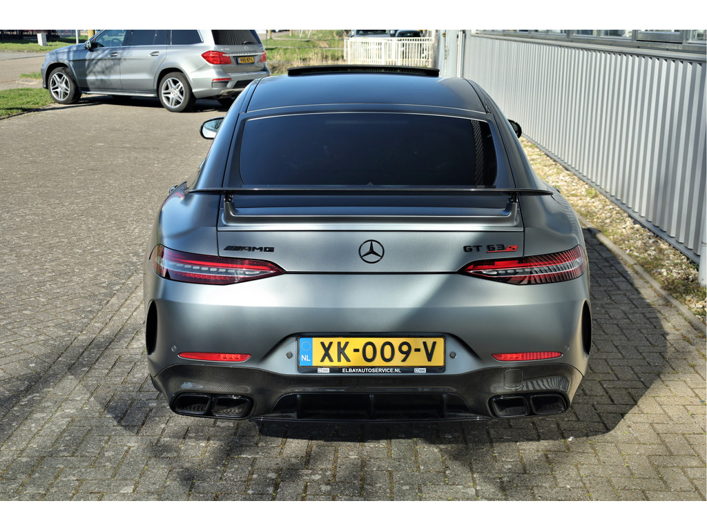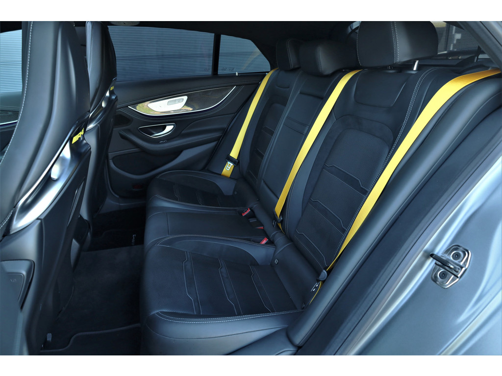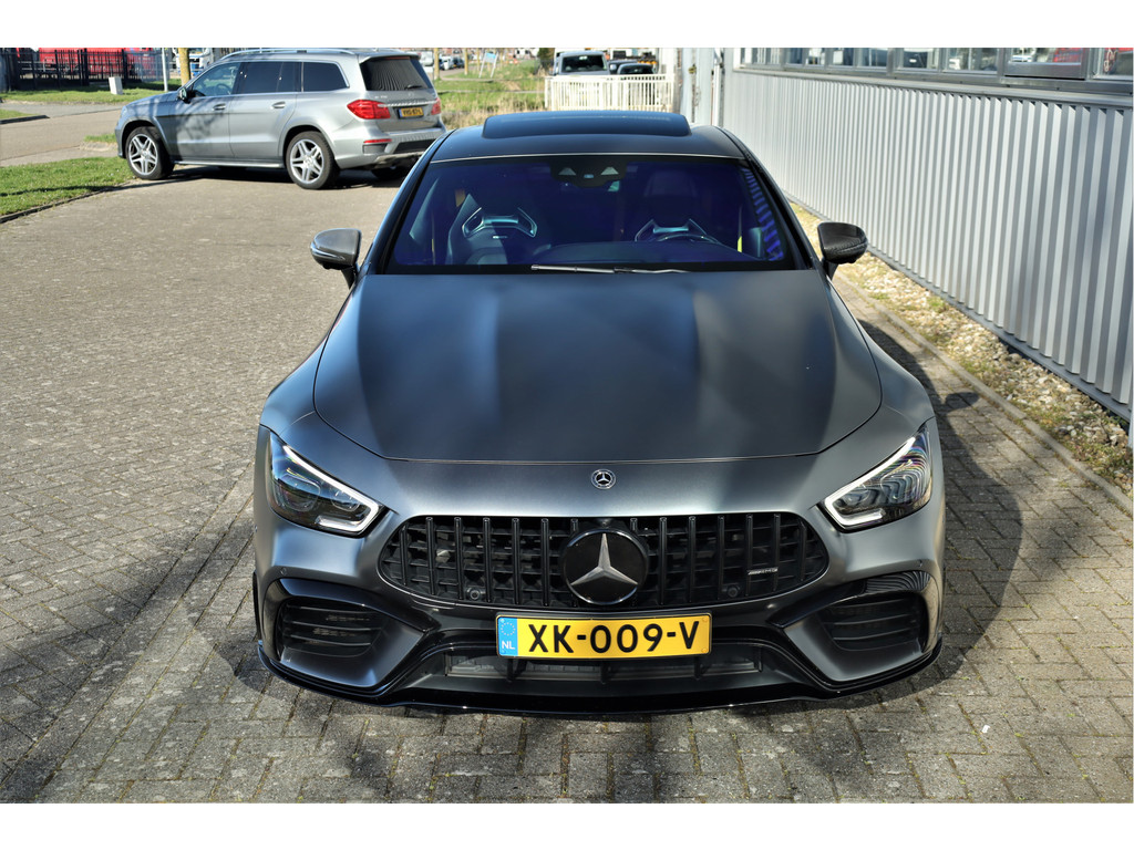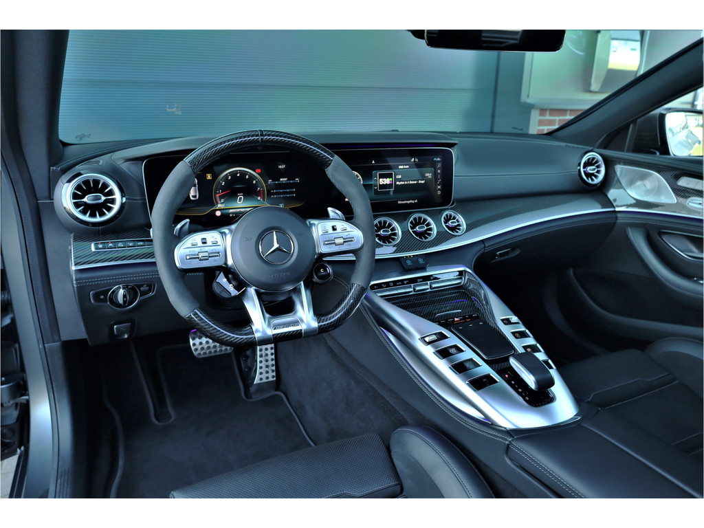 Retesnelle en bomvolle Mercedes AMG GT 63 S 4MATIC+ Premium Plus, uitgevoerd in seleniet grijs magno met een zwart leder exclusief interieur; een schitterende combinatie.