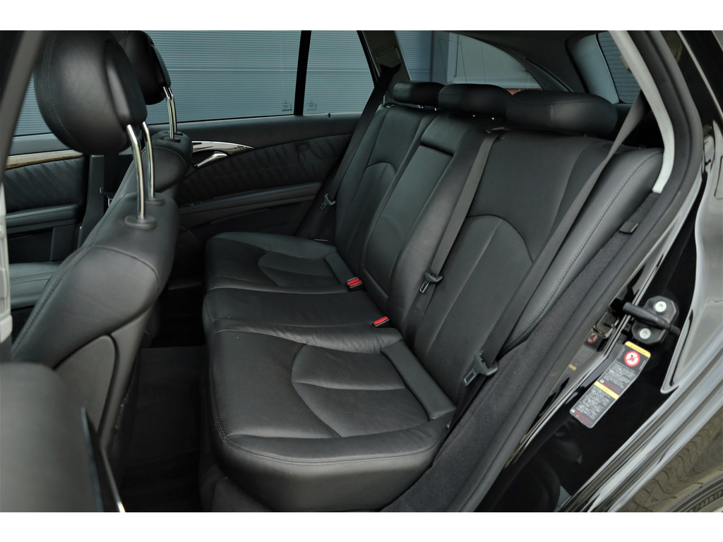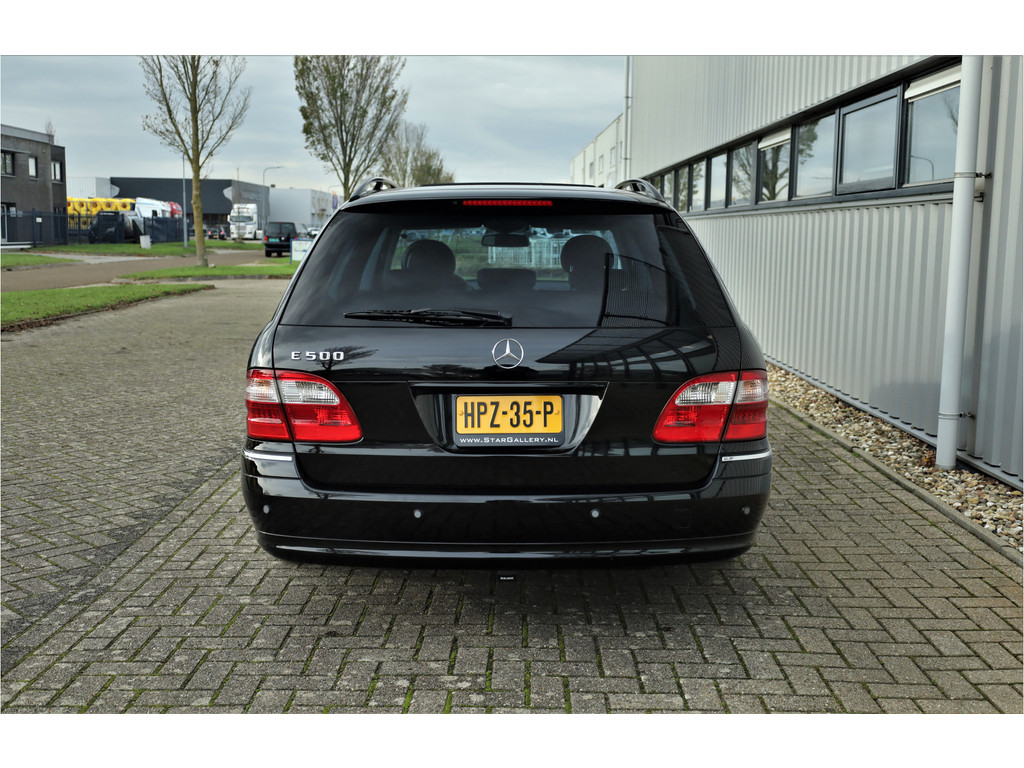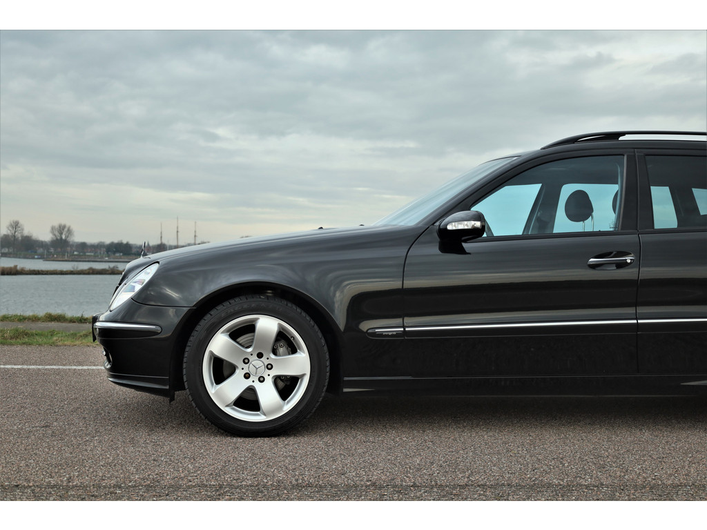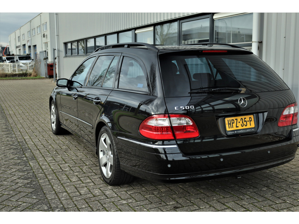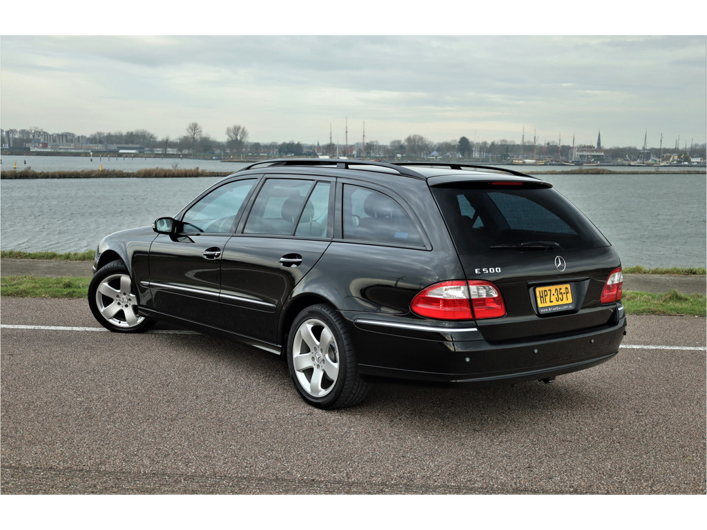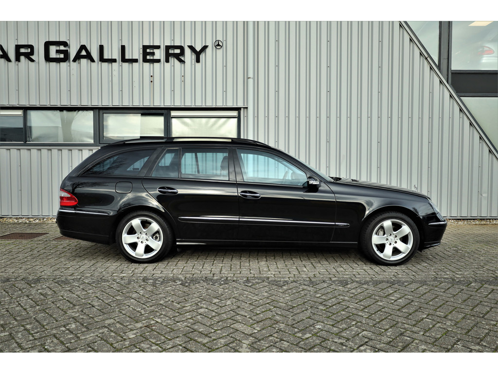 Sportieve fiscaal aantrekkelijke Mercedes E500 Combi Avantgarde met de begeerlijke 7G-Tronic automaat, uitgevoerd in obsidiaan zwart metallic met een zwart leder interieur.