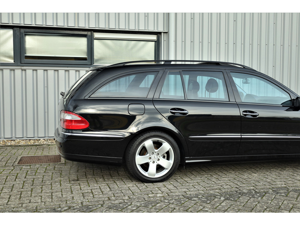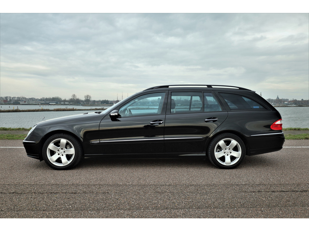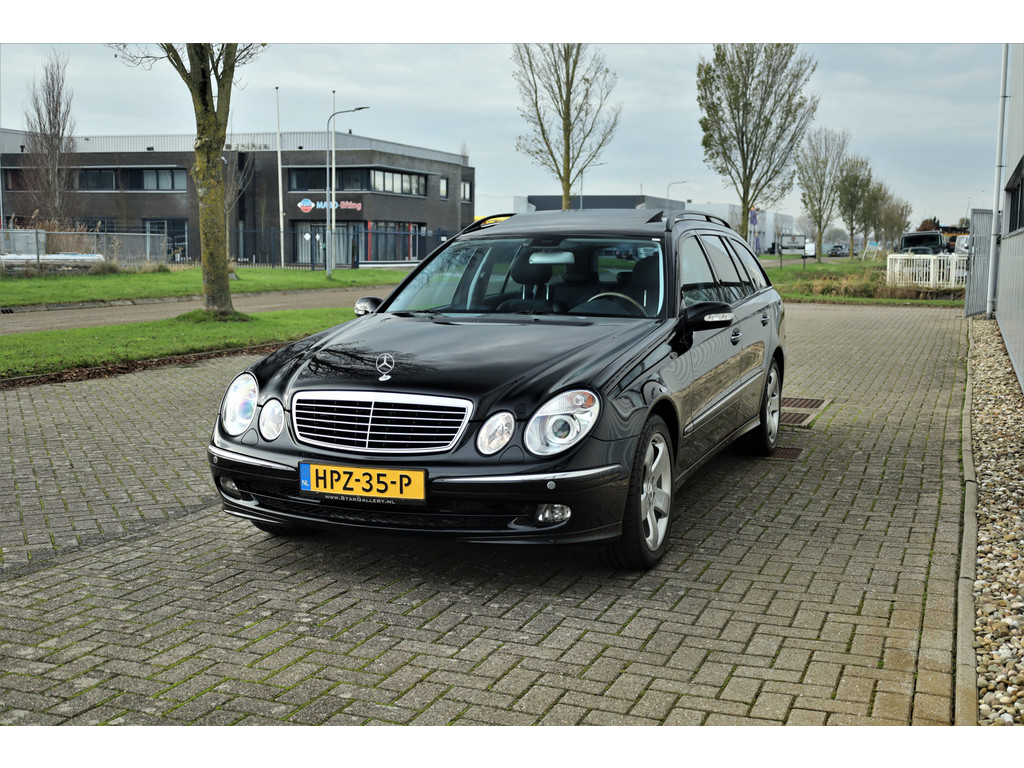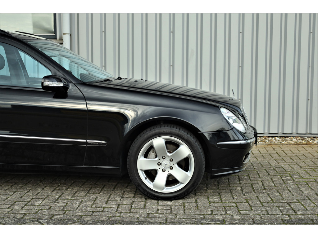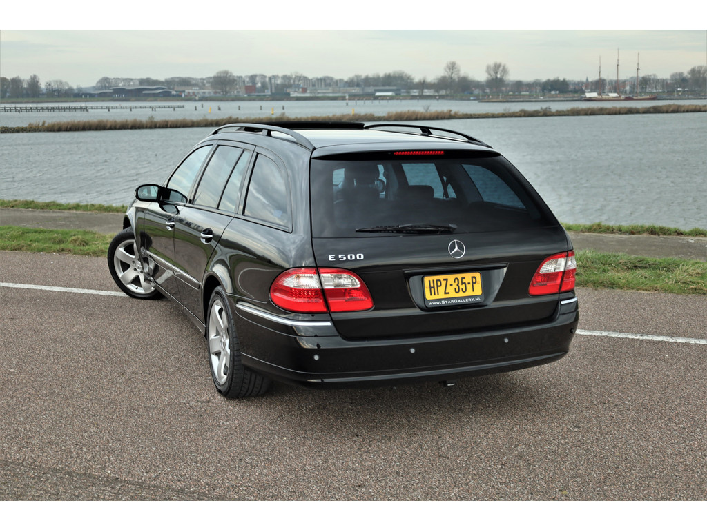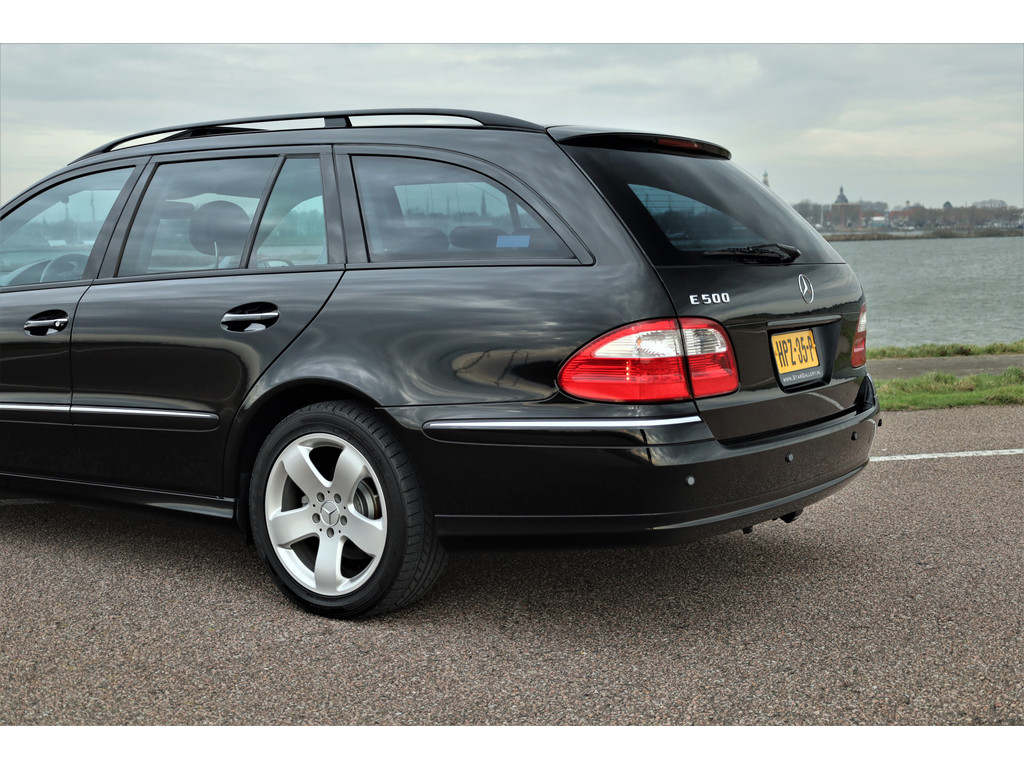 Sportieve fiscaal aantrekkelijke Mercedes E500 Combi Avantgarde met de begeerlijke 7G-Tronic automaat, uitgevoerd in obsidiaan zwart metallic met een zwart leder interieur.