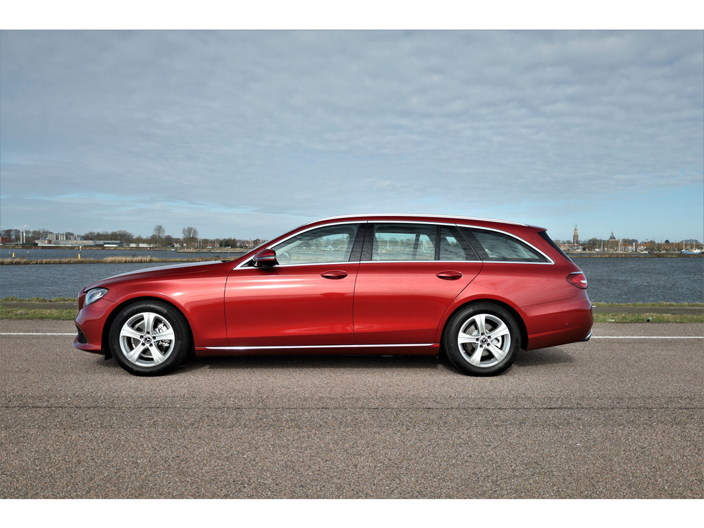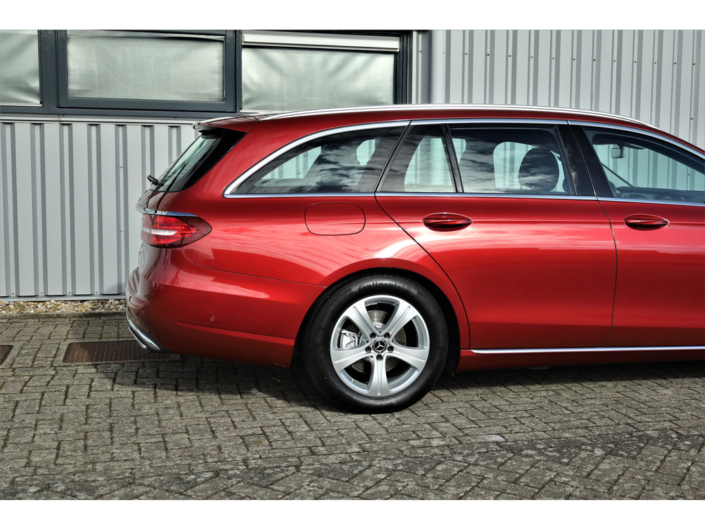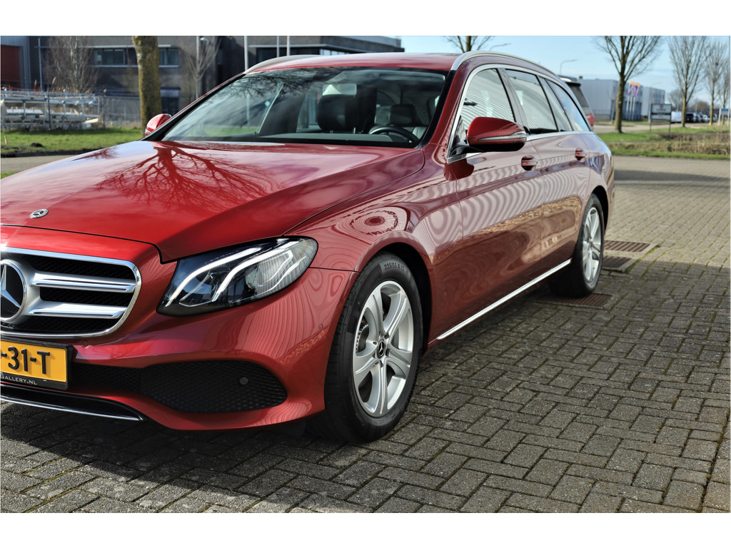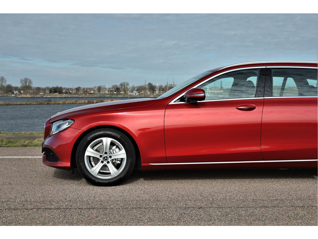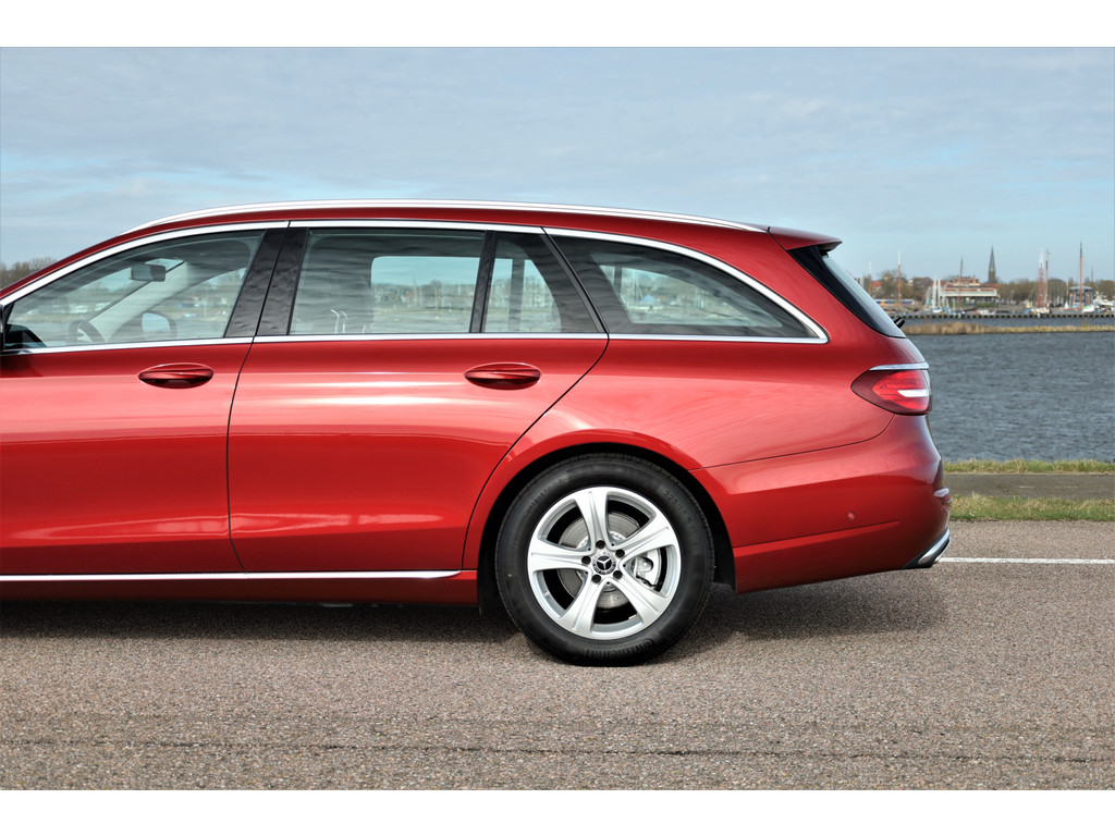 Schitterende Mercedes E200 Estate Avantgarde, uitgevoerd in de fantastische kleur hyacint rood metallic en dit is weer eens wat ander dan grijs of zwart zoals je ze zo vaak tegenkomt.